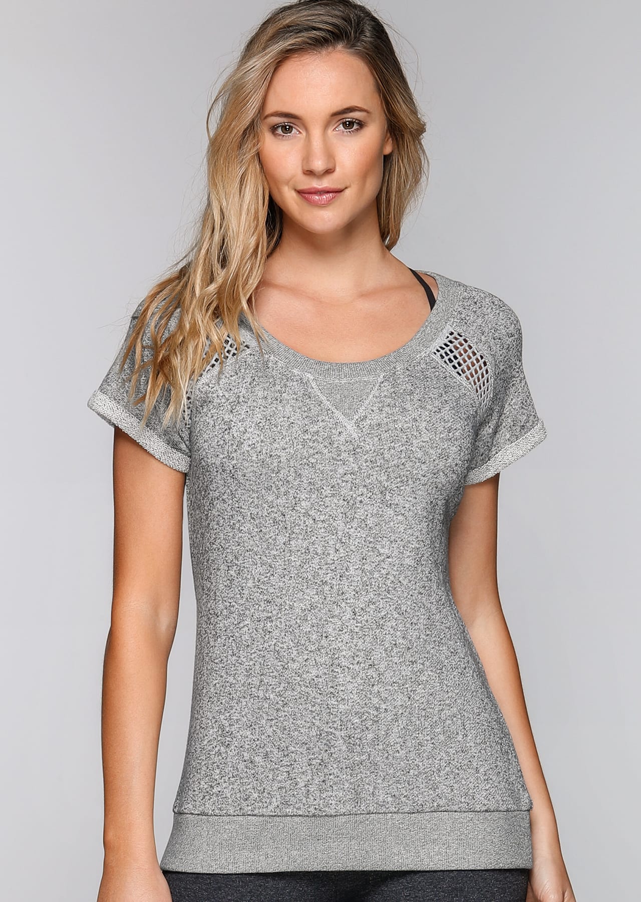Fitness Mania – Palm Springs Sweat S/Slv Top Designer Notes: The ultimate in sports luxe styling. Add this to your active or athleisure wardrobe for an instant style update. You will love the breathable mesh panelling and open back design, equally perfect for Barre or breakfast. Let’s Talk Tech: Two- way stretchEasy careBreathableShrink and fade resistantCrease resistant Layering piece How We Style It: Throw this sweat top on over the Coachella Seamless Bra and Coachella Seamless F/L Tight to unwind after your Yoga session. On your way to