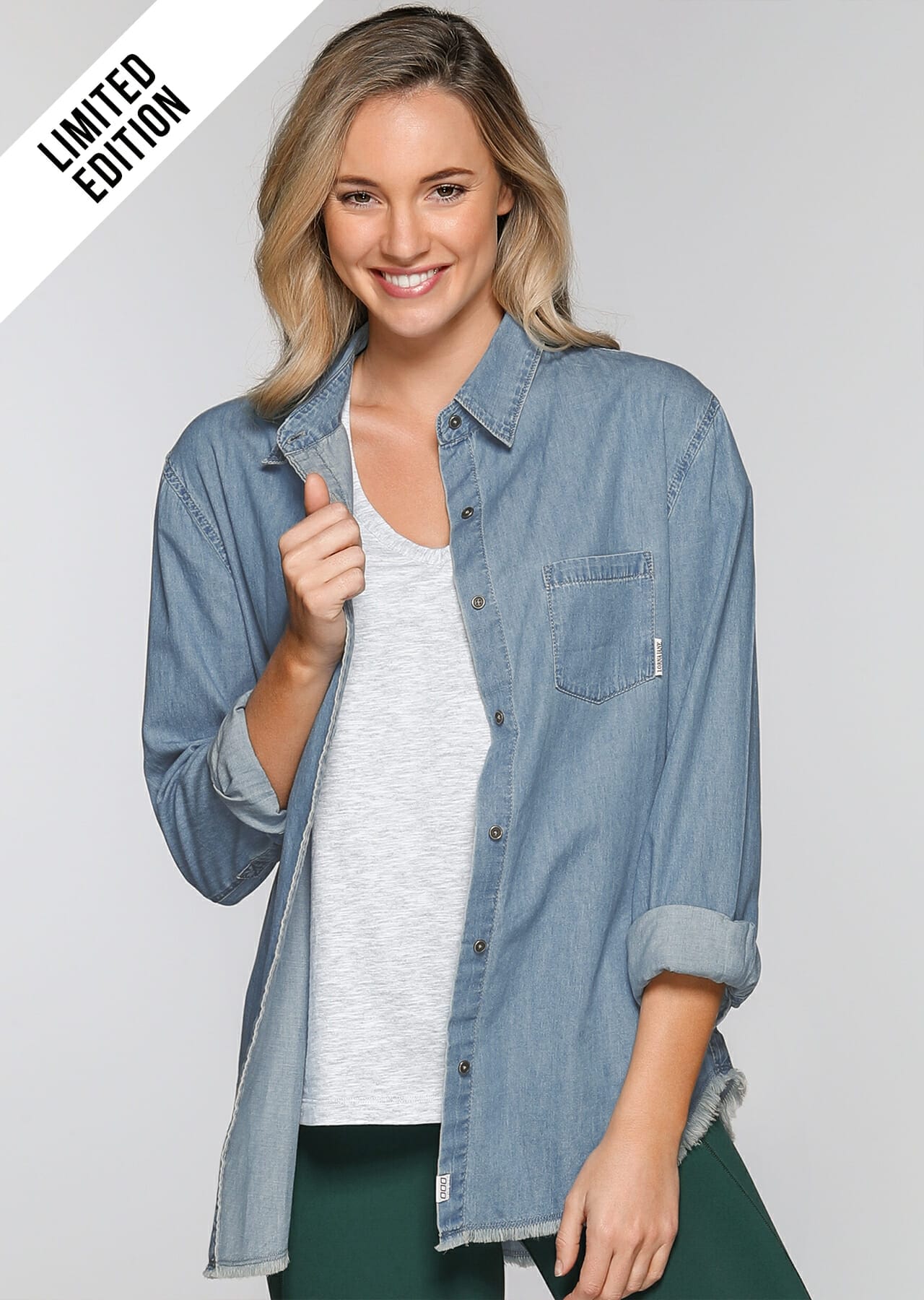 Fitness Mania – Tone Denim L/Slv Shirt Designer Notes: Transition your activewear into lifestyle wear with this relaxed fit denim shirt. Whether it’s tied around your waist over your activewear for a more casual look or worn with tights and heels for a night out, you will love the versatility that this shirt can bring to your wardrobe. The soft breathable material, with full button through and extended hemline will ensure you are always comfortable whilst being trendy. Let’s talk techFull button through with collar and button sleeves