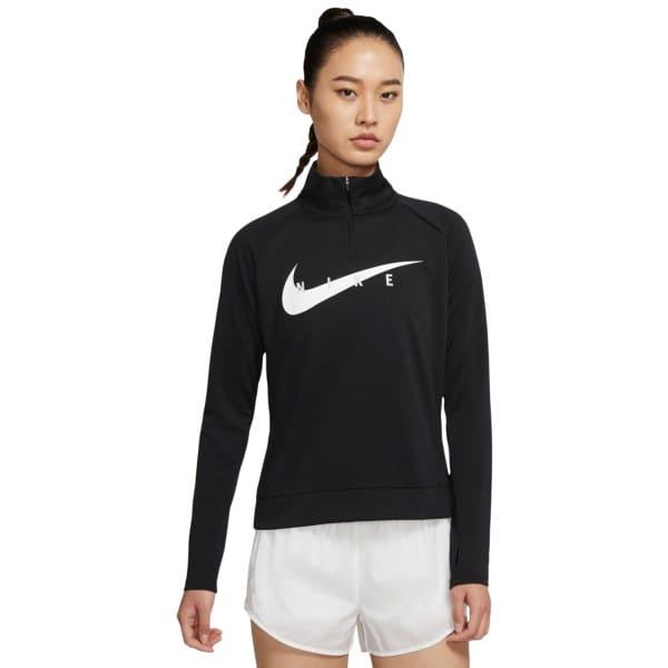 Fitness Mania – Nike Swoosh Run Womens Running Top The Nike Swoosh Run women’s running top is your essential coverage to stay fresh and focussed on the road. It’s a member of Nike’s Swoosh Run family – combining a street-inspired look with run-ready technologies. A shimmery oversized Nike Swoosh pairs with a matte black “NIKE” graphic to turn heads. It’s easy to customise the airflow with the half zip closure to meet the changing demands of your daily training. Thumbholes create a snug feel and prevent the sleeves from flapping on your runs. – G