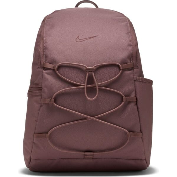 Fitness Mania – Nike One Womens Training Backpack Bag – Smoky Mauve You?ll never have to toss and turn over what to bring to the gym, work or school with the Nike One women?s training backpack? combining a spacious design with modern style. Everything has its place? your laptop has a safe home in the padded sleeve, your yoga mat can be secured with the elastic bungee cord and even your sunnies have a spot of their own in the sleek soft-lined upper back pocket. One zip side pocket and one slip-in side pocket let you tuck away essentials in close reach. A me