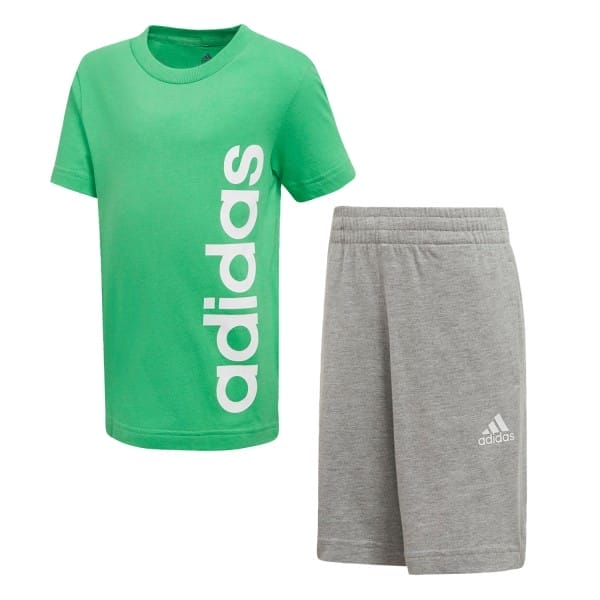 Fitness Mania – Adidas Little Kids Linear Training Summer Set – Energy Green/Grey/White The Adidas little kids? linear training summer set keeps your little one ready for action, whether they?re playing catch with the family or running wild with the sand between their toes. Cotton jersey fabric provides a feather-soft feel against their skin. They get a bright tee with contrasting Adidas logo for fun, sporty vibes. The matching shorts feature an elastic waist with drawcord for an adjustable fit. The side seam pockets on the bottoms provides a home for their little treasures.