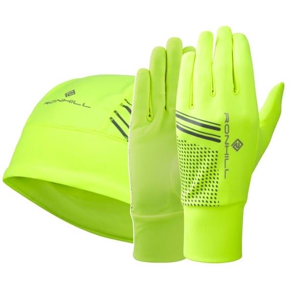 Fitness Mania – Ronhill Running Beanie and Glove Set – Fluro Yellow/Black The Ronhill running beanie and glove set ensures you don’t have to put a pause on your training when the mercury drops this season. Crafted from Thermalite fabric, this running set aids in temperature regulation? allowing warm air to circulate so you can tackle chilly runs from road to trail. Mesh panels ensure you stay fresh and focussed when you shift the pace up a gear for a distraction-free run. – Essential running beanie and glove set to keep you primed for cold weather runs – Lig