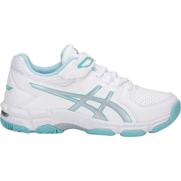 Fitness Mania – Asics Gel 540TR PS – Kids Girls Cross Training Shoes – White/Porcelain Blue/Silver The Asics Gel 540TR kids’ cross training shoes are awesome for court sports like basketball, netball and tennis. This lightweight design has a SpEVA Lasting 55 midsole for a great response and feel while the DuoMax and midfoot Trusstic team up for excellent torsion stability and arch support. It?s perfect for little athletes mastering side to side motion with a synthetic leather upper The 540TR PS also features Gel cushioning for shock absorption and a durable Asics High Abrasion Resistant ru