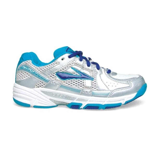 Fitness Mania – Brooks Maximus Leather – Kids Girls Cross Training Shoes – White/Caribbean Sea/Blue The Brooks Maximus Leather kids? cross training shoes have the tough design of a cross-trainer and awesome feel of a runner all in one so your little girl?s feet are sure to love them. No kid wants a sweaty sock (yuck!) but with the full-grain leather and air mesh upper her feet stay cool, dry and fresh. Your sporty kid gets adaptive cushioning from the smart Bio-MoGo DNA midsole so she can cruise smoothly through her workout. She gets a supportive ride from the PDRB medial post and the non
