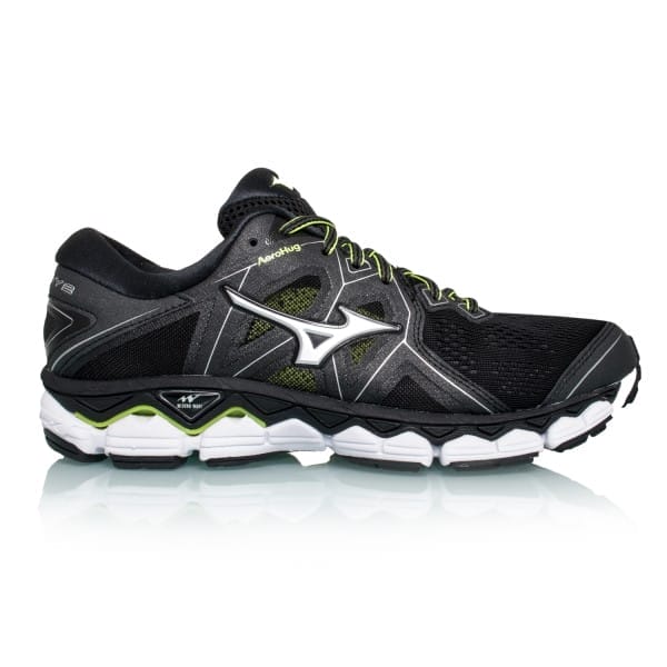Fitness Mania – Mizuno Wave Sky 2 (D/2E) – Mens Running Shoes – Black/Silver/Safety Yellow The Mizuno Wave Sky 2 men?s running shoes are your go-to for flying over the pavement with top-of-the-line cushioning and a luxurious feel. In its latest evolution, Mizuno have included a fresh upper with AeroHug technology to sculpt to your foot with just-right stretch, enhancing fit and your comfort. It offers a secure hold around your midfoot and arch so your favourite runners won’t go soaring off without you, and is ultra-breathable to tackle intense sweat sessions. Lace up in plush co