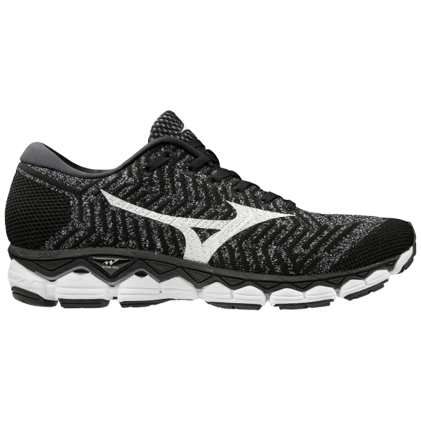 Fitness Mania – Mizuno WaveKnit Sky S1 – Mens Running Shoes – Black/White The Mizuno WaveKnit Sky S1 men?s running shoes are your go-to for flying over the pavement with top-of-the-line cushioning and a luxurious feel. In its latest evolution, Mizuno introduces WAVEKNIT. With a wave construction this new type of material provides a natural and dynamic fit though its unique stretch and hold abilities, whilst also maintaining a great degree of breathability. It offers a secure hold around your midfoot and arch so your favourite runners won’t go soaring off without y