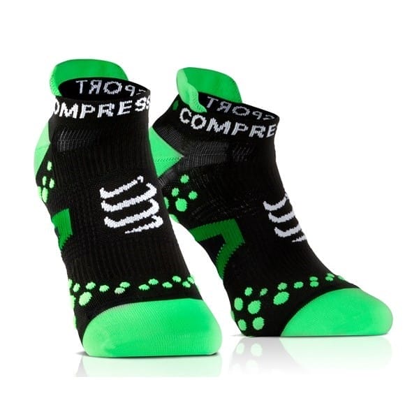 Fitness Mania – Compressport Low Cut Running Socks – Black/Green The Compressport Performance Running Socks are a must have for all Runners! Inbuilt with unique 3D.DOTS – these dots act as shock absorbers, cushioning the impact on your feet while also providing better grip inside your shoe, better blood circulation and Achilles/Heel protection. They are also anatomically correctly designed with Archstim Support, Ventilation Mesh and Total Water Extract. Being made by Compressport they use 100% European Materials making them extremely durable and long lasti