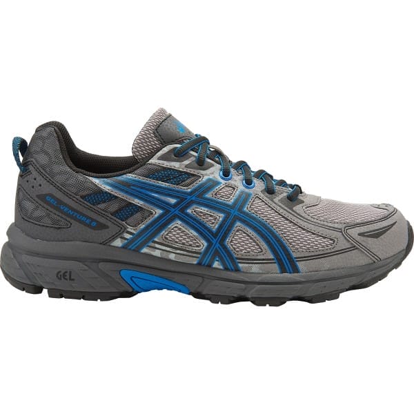 Fitness Mania – Asics Gel Venture 6 – Mens Trail Running Shoes – Aluminium/Black/Directoire Blue The Asics Gel Venture 6 men?s trail running shoes are a must-have for adventure seekers wanting to switch up the concrete jungle for nature at its wildest. The upper and midsole have been redesigned to tackle the toughest terrain. Rearfoot Gel cushioning reduces shock on impact with a plush feel and smooth transition. The aggressive one-piece outsole and multi-directional lugs give you ultimate traction so you never have to hesitate when you come across rocky paths and dusty trails. The