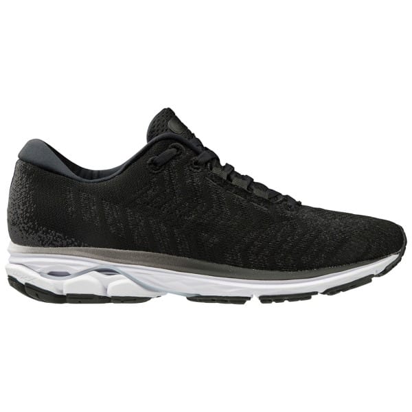 Fitness Mania – Mizuno Wave Rider Waveknit 3 – Womens Running Shoes – Black/Dark Shadow Delivering a featherlight ride to float over the pavement, the Mizuno Wave Rider Waveknit 3 women?s running shoes feature a Waveknit upper that hugs precisely to your feet. Sleek with modern styling, it gears you up with a DynamotionFit system that keeps your natural biomechanics in mind? allowing the running shoe to move in harmony with your foot. A SmoothRide midsole made from a fusion of U4icX and U4ic compounds ensures springy, ultra-fluid transitions to snap back into your runs. Mizu