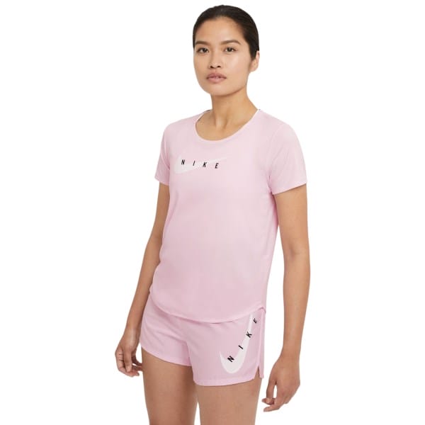 Fitness Mania – Nike Swoosh Run Womens Running T-Shirt – Pink Foam/Reflective Silver Boost your motivation and comfort with the Nike Swoosh Run women?s running t-shirt? an instant staple for your urban runs and active days. A member of Nike?s Swoosh Run family, it combines a street-worthy look with run-ready details to elevate your workout wardrobe. The? NIKE? and Swoosh graphic creates a smooth fusion of glossy and matte details. Dri-Fit technology ensures dry comfort for the long haul. Side vents improve your range of motion for zero distractions You’ll reach your run