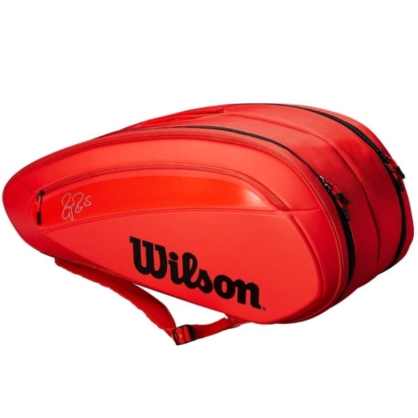Fitness Mania – Wilson Federer DNA 12 Pack Tennis Racquet Bag The Wilson Federer DNA 12 pack tennis racquet bag is the ultimate choice for competitive players and can fit up to 12 of your favourite weapons. That?s a serious arsenal! It has sophisticated styling inspired by Roger Federer?s racquet and keeps your gear protected with Thermoguard 2.0 technology to shield strings from the elements. Stash your essentials in the large front and back accessories pockets, or even toss in a change of shoes! This ultra-durable design has a quick grab handle at