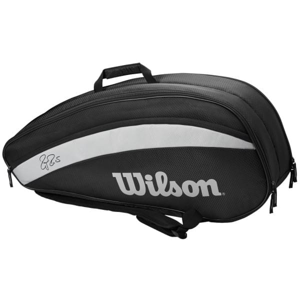 Fitness Mania – Wilson Federer Team 6 Pack Tennis Racquet Bag 2020 – Black/White The Wilson Federer Team 6 Pack tennis racquet bag 2020 couples modern styling with a functional design for the court. Roger?s signature logo creates a bold detail on both sides. Two large main compartments comfortably stash up to 6 tennis racquets for your next tournament. A pair of outer side pockets offer easy organisation of your accessories. Carry it your way with backpack shoulder straps or quick grab top handle. – Bold, refined style to load up your tennis essentials – Roger?s signat
