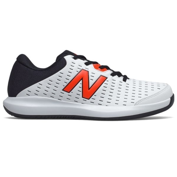Fitness Mania – New Balance 696v4 – Mens Tennis Shoes – White/Orange/Black The New Balance 696v4 men’s tennis shoes set you up with a court-ready synthetic and mesh upper for comfort during practice and competitive matches. Perforations in the forefoot create a ventilated ride so heat and humidity won’t weigh down your performance as you strive for total court-domination. A super light yet cushioned REVlite midsole lets you command the court in comfort. This go-to men’s tennis shoe is suitable for play on hard courts with a herringbone outsole and Ndurance rubber