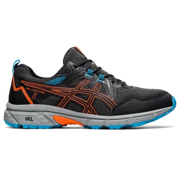 Fitness Mania – Asics Gel Venture 8 – Mens Trail Running Shoes – Black/Marigold Orange The Gel-Venture 8 Trail running shoe is designed for the great outdoors. This versatile shoe is excellent for trail runs, light hiking or exploring a new city. This model has been updated with a more accommodating forefoot fit, while reducing the amount of overlays around the forefoot without sacrificing durability. Lastly, the outsole is more durable with a traction pattern that’s been improved with re-engineered lugs under the heel. All of these updates make the new Gel-Venture 8 a recommend