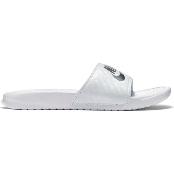 Fitness Mania – Nike Benassi Just Do It – Womens Casual Slides – White/Metallic Silver The Nike Benassi Just Do It women?s casual slide is your bestie for quick slip-on and go, with sporty vibes to boost your weekend get-up. You?ll never want to go back to daggy old flip flops again. These slides are ultra-comfy with a foam midsole and outsole for lightweight protection as you cruise the urban streets. – Cushioned, slip-on comfort – Nike logo shows off your athletic style – Synthetic upper with jersey lining – Plush cushioning from Phylon foam of midsole and outsole