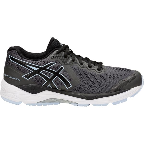 Fitness Mania – Asics Gel Foundation 13 – Womens Running Shoes – Dark Grey/Black The Asics Gel Foundation 13 women?s running shoes provide essential stability and support for overpronators. It is a staple for runners with wide feet or who would benefit from orthotics. Lace up with the enhanced fit of the upper and run in comfort with the expanded forefoot for decreased irritation and a roomy feel. The SpEVAfoam and Solyte midsole provides top notch cushioning and support for your daily training. The AHAR (Asics High Abrasion Rubber) sponge outsole gives you the durabil