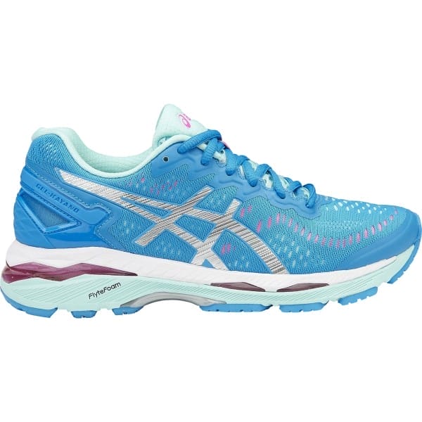 Fitness Mania – Asics Gel Kayano 23 – Womens Running Shoes – Diva Blue/Silver/Aqua Splash The Asics Gel Kayano 23 women?s running shoes takes a popular favourite to the next level and is an amazing choice for managing mild to moderate overpronation. It weighs in lighter than its predecessor so you can glide over the road like cruising on clouds. The FluidFit upper wraps around your foot perfectly for a custom fit and features reinforced and multi-directional stretch. FlyteFoam is an ultra-lightweight cushioning material (the lightest ever from Asics!) that lets you breeze throu