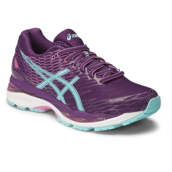 Fitness Mania – Asics Gel Nimbus 18 – Womens Running Shoes – Purple/Turquoise/Flamingo The Asics Gel Nimbus 18 women?s running shoes are the perfect match for rigid foot types with a natural running style, delivering plush comfort and a cushioned ride. It features an innovative engineered/jacquard mesh upper with minimal material overlays and seams for enhanced fit and comfort. The Ortholite Lasting and Fluid Ride midsole give you the plushest feel and maximum comfort yet from this series. You get a durable External Heel Counter for superior support and Convergence Gel strate