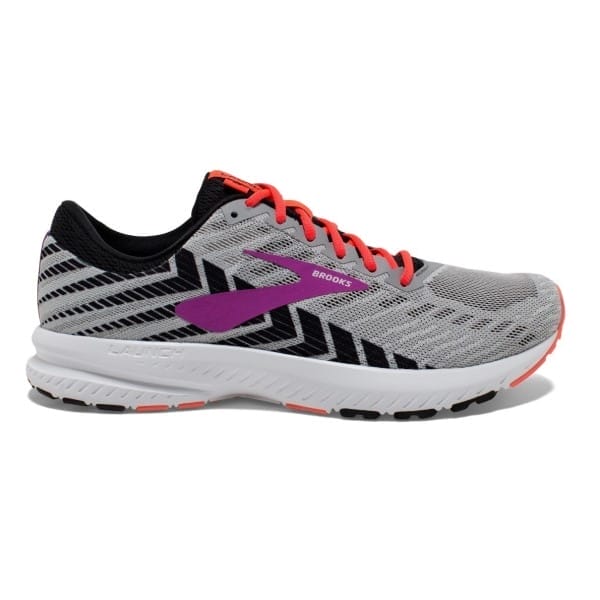 Fitness Mania – Brooks Launch 6 – Womens Running Shoes – Grey/Black/Purple The Brooks Launch 6 women?s running shoes are your sporty all-rounder with key flexibility and comfort for running, combined with the versatility for gym, spin class or however you love to sweat it up. As a running shoe first and foremost, the Launch 6 features a breathable one-piece mesh upper for an airy, barely there feel as you fly over the pavement. The midsole has been revamped with extra foam beneath the forefoot for a snappy, lively ride that?s as fast as ever. BioMoGo DNA cushionin