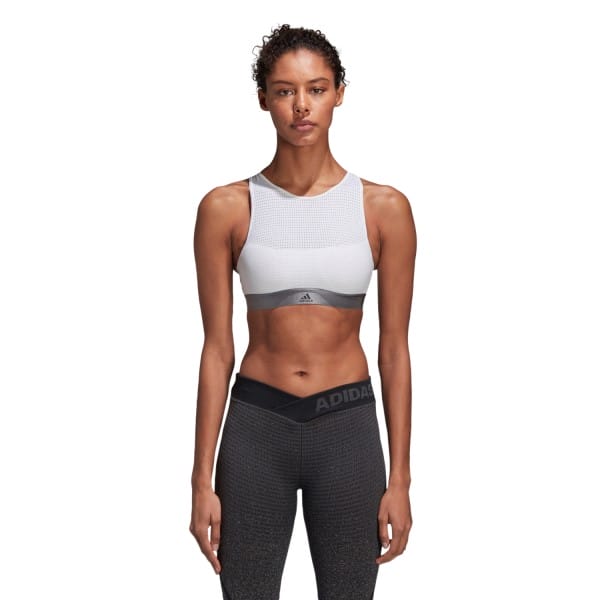 Fitness Mania – Adidas Womens Halter Sports Bra 2.0 – White/Grey The Adidas women?s halter sports bra 2.0 is your lightweight protection against sweat with medium support to beat the bounce. With generous coverage at the front and a fun, strappy look at the back, you?ll never want to hide this sporty gem under a tee. The Power Mesh lining provides a breathable, fast-drying design. Removable pads offer a flattering shape and the soft fabric keeps you moving in comfort. – Lightweight and airy sports bra for medium support – High neckline for coverage p