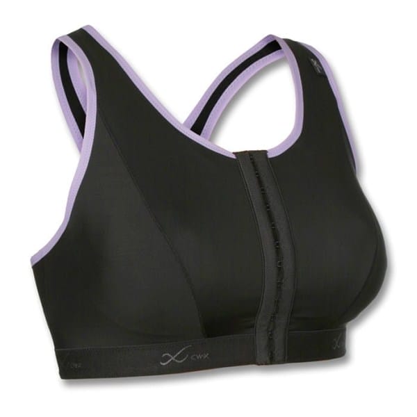 Fitness Mania – CW-X XTempo Support Running Sports Bra – Black/Lavender The CW-X XTempo Support Running Bra offers balance, support and comfort with 9 front hook/clasp closures for easy on/off and a racer-back fit. Each cup is equipped with CW-X’s patented 5-point Targeted Support Web and is reinforced with side supports and extra web overlay. The Coolmax/Lycra tricot fabric with front and back Lite-Stretch mesh panels helps to wick moisture away from your body and provide you with extra breathability keeping you cool and comfy. The sports bra also features a wid