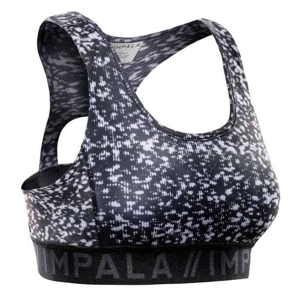 Fitness Mania – Impala CR-1 Crop Womens Sports Bra – Black Speckle The Impala CR-1 Crop women?s sports bra is perfect for keeping your girls cool, comfy and supported when you?re hitting up the miles or tackling the gym. Your favourite new sports bra has a racerback style for a flattering shape, features 4 way stretch for freedom of motion and breathable, quick-drying fabric. – Reflective print for extra style – Extra wide elastic panels for enhanced comfort – Mesh lined panels – Stay free from chafing from flat locked seams – Concealed pocket