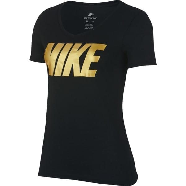 Fitness Mania – Nike Sportswear Metallic Womens Casual T-Shirt – Black/Gold The Nike Sportswear Metallic women?s casual t-shirt is made of soft cotton for a dreamy feel against your skin. It features a large Nike graphic for a metallic pop and a stylish V neck cut. Your sporty tee is slim fitting for a flattering silhouette. The lengthened back hem provides additional coverage to coast through your day. – Ultra-soft cotton for everyday comfort – Eye-catching Nike metallic graphic – Comfy V neck – Flattering slim fit – Longer back hem for just-right coverage F