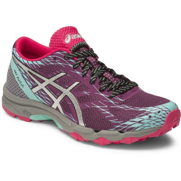 Fitness Mania – Asics Gel Fuji Lyte – Womens Lightweight Trail Running Shoes – Plum/Silver/Pool Blue The Asics Gel Fuji Lyte women?s lightweight trail running shoes have a stylish look and seamless comfort for taking your fitness off-road. You can move freely with the lightweight upper and get a distraction free ride with the Lace Garage technology allowing you to secure the laces away without a problem. The rock protection plate shields you from stones and the Solyte midsole material offers cushioned comfort and a tough design for challenging trails. The aggressive trail-specific outsole