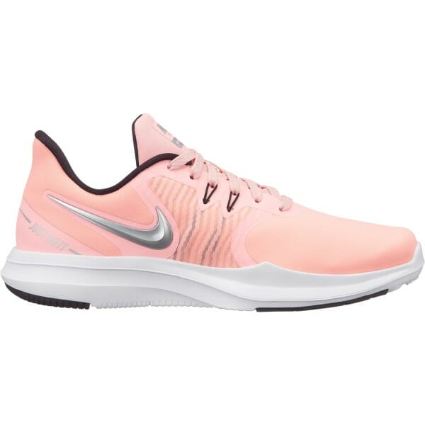 Fitness Mania – Nike In-Season TR 8 – Womens Training Shoes – Pink Tint/Metallic Silver/Burgundy Ash The Nike In-Season TR 8 women?s training shoe is your lightweight gym buddy for cardio sessions and circuit training. An airy mesh upper with closed-hole mesh creates a smooth feel and durable comfort. Flywire cables work together with the lacing system for a locked-in fit. Fly through your sweat session in cushioned comfort with the dual-density foam midsole. The durable outsole features rubber pods for a grippy platform to master multi-directional motion and the flex grooves let your fee