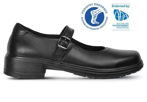 Fitness Mania – The Ascent Womens Adela Buckle Black is a durable black leather work or school shoe from Ascent, featuring a Mary Jane style adjustable strap. The durable outsole provides a grip on a variety of surfaces, and the heel cushioning helps with shock absorption for adults or young and older teenagers at school.
